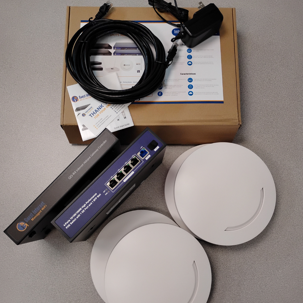 The GUEST-1 kit is simple to install for any hotel and packed with powerful features. It delivers superior performance at a lower cost compared to other solutions. The GIS-R4 controller securely shares your Internet connection among many guests while preventing abuse. This kit comes pre-configured and almost ready to use—just complete the quick GIS-R4 setup wizard to create your custom login page. No special technical skills are needed. You can choose how to manage guest Internet access, with access codes being a popular option.